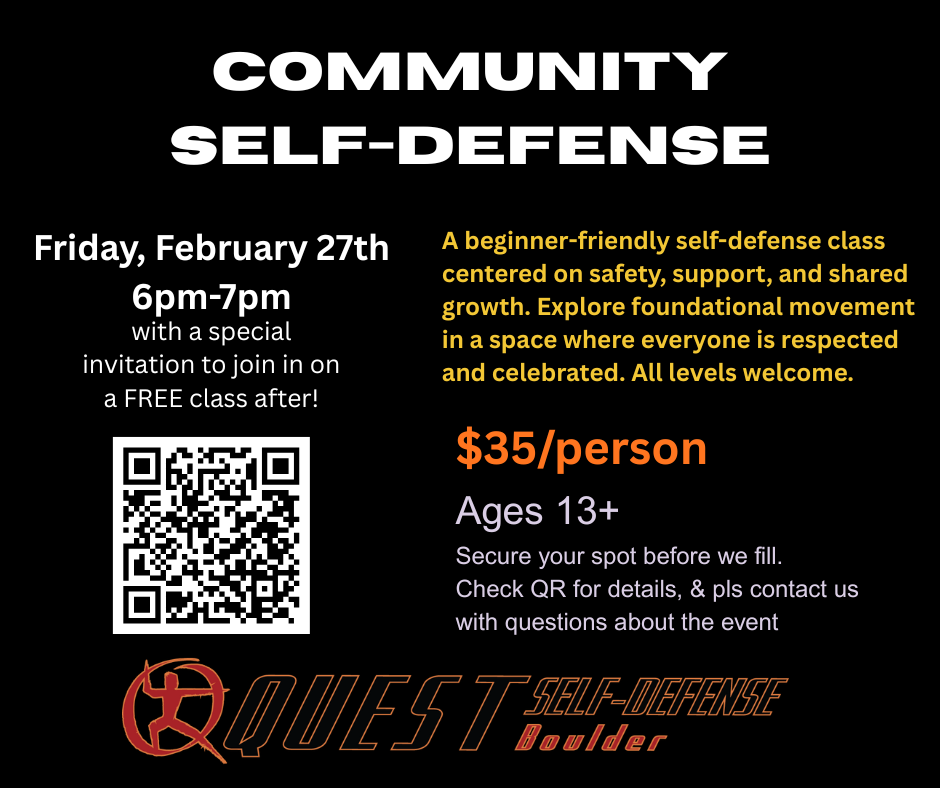 I love training at the Boulder Quest Center with my kids. The principles taught reinforce what we are trying to cultivate in our family: compassion, strength, knowing who you are and taking care of yourself and others in healthful ways.